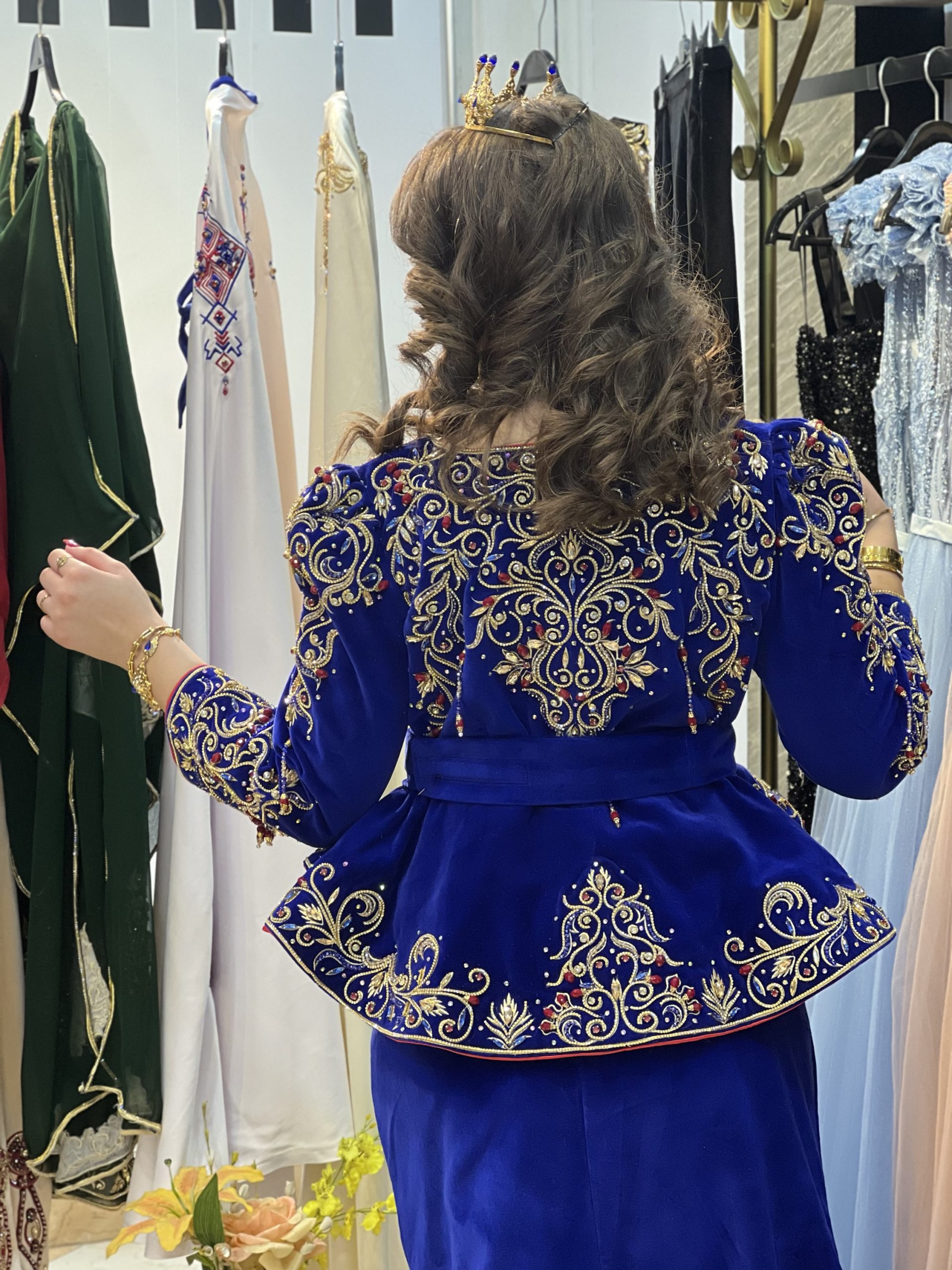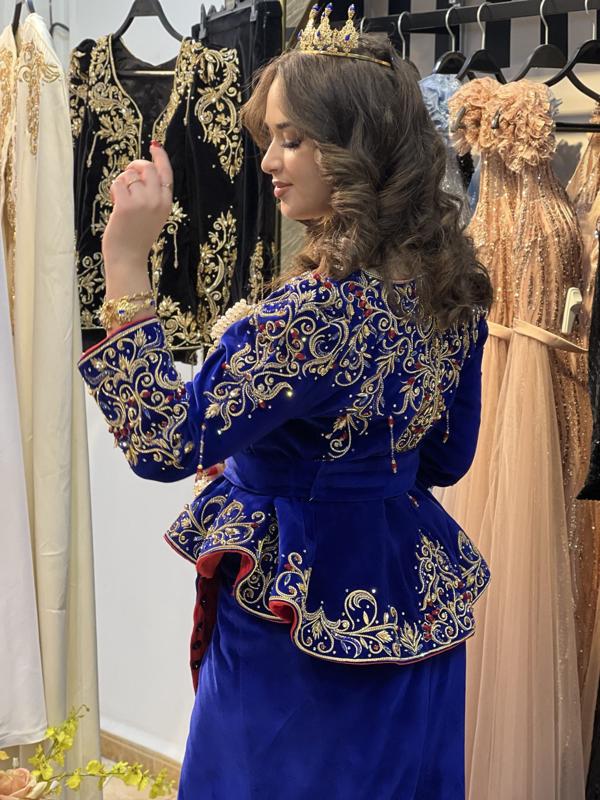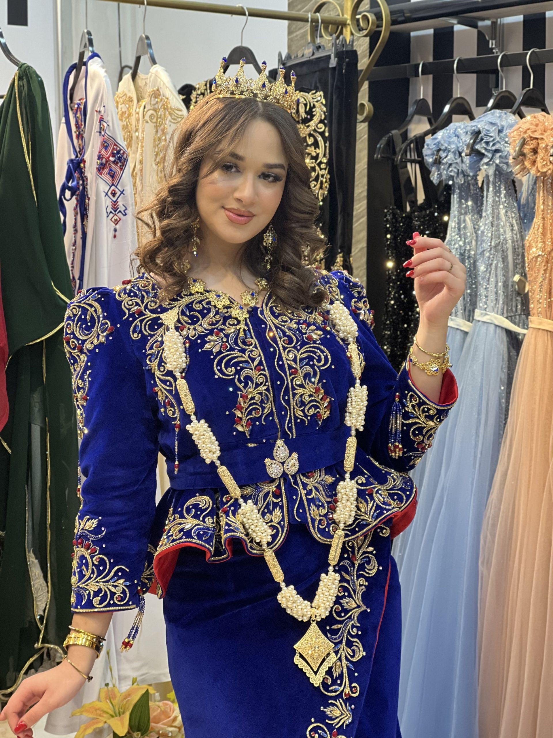 Élégance et raffinement s’invitent avec ce Karakou bleu turquoise au doublé rouge profond, subtilement brodé à la main de fils dorés et perlé avec soin.